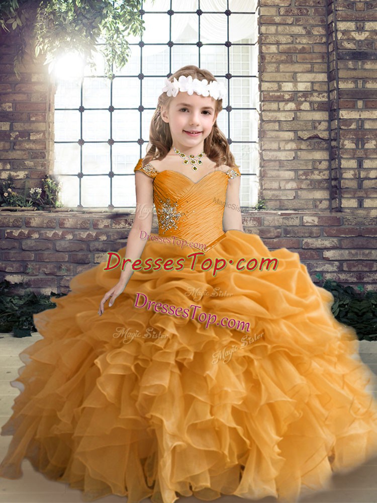 Orange Kids Pageant Dress Party and Wedding Party with Beading and Ruffles and Pick Ups Straps Sleeveless Lace Up