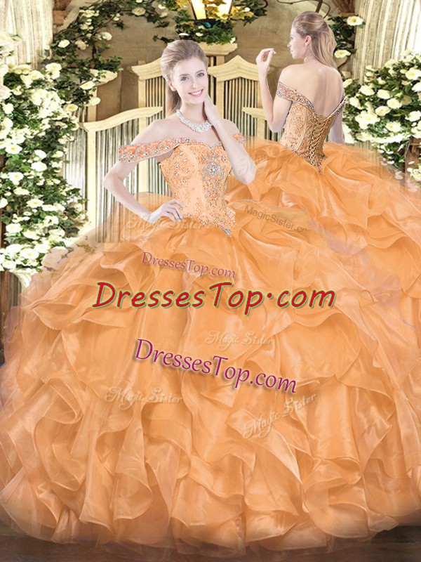 Orange Quinceanera Dresses Military Ball and Sweet 16 and Quinceanera with Beading and Ruffles Off The Shoulder Sleeveless Lace Up