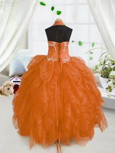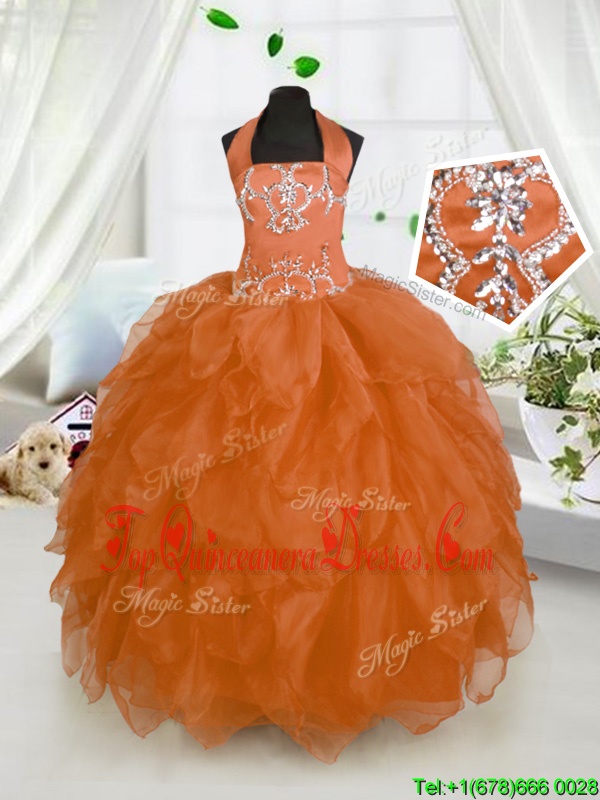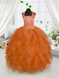 Orange Red Ball Gowns Halter Top Sleeveless Organza Floor Length Lace Up Beading and Ruffles Pageant Dress for Womens