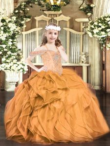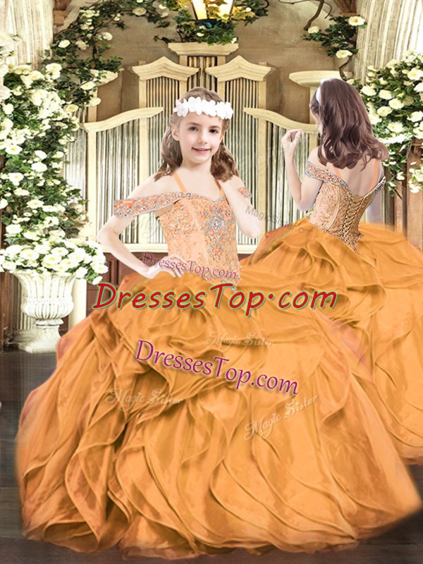 Orange Red Ball Gowns Organza Off The Shoulder Sleeveless Beading and Ruffles Floor Length Lace Up Pageant Dresses