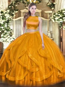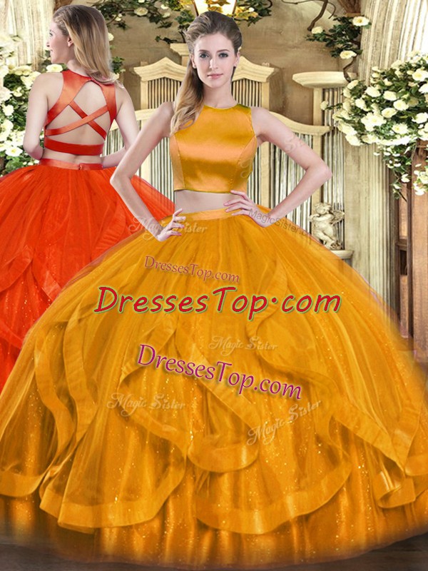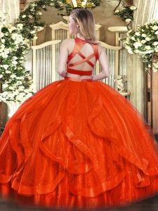 Orange Red Criss Cross Quince Ball Gowns Ruffles Sleeveless Floor Length