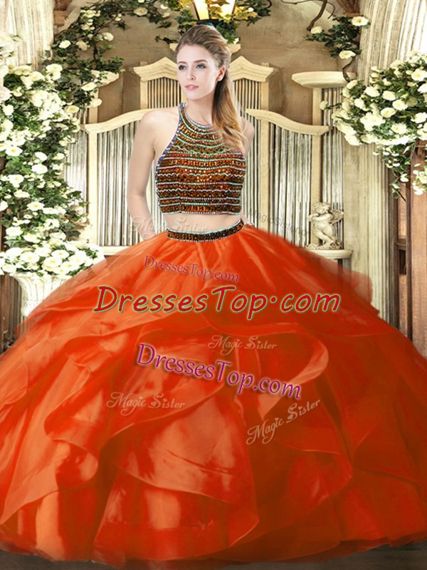 Orange Red Organza Zipper Sweet 16 Dress Sleeveless Floor Length Beading and Ruffles