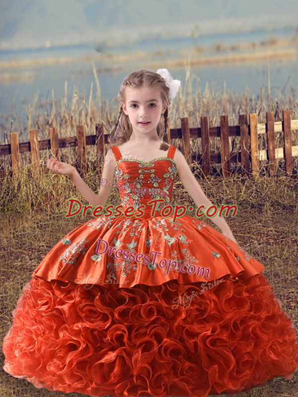 Orange Red Straps Lace Up Embroidery Girls Pageant Dresses Sweep Train Sleeveless