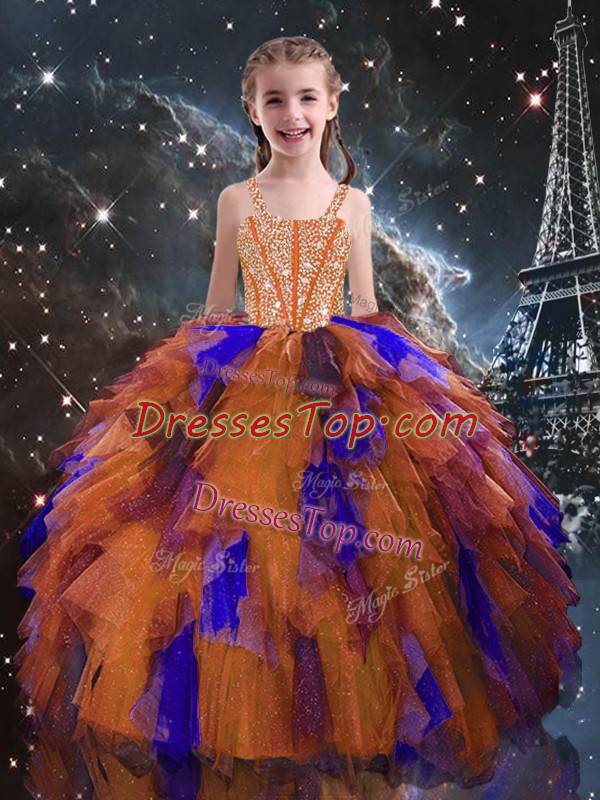 Orange Red Straps Neckline Beading and Ruffles Evening Gowns Sleeveless Lace Up
