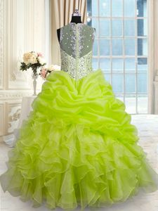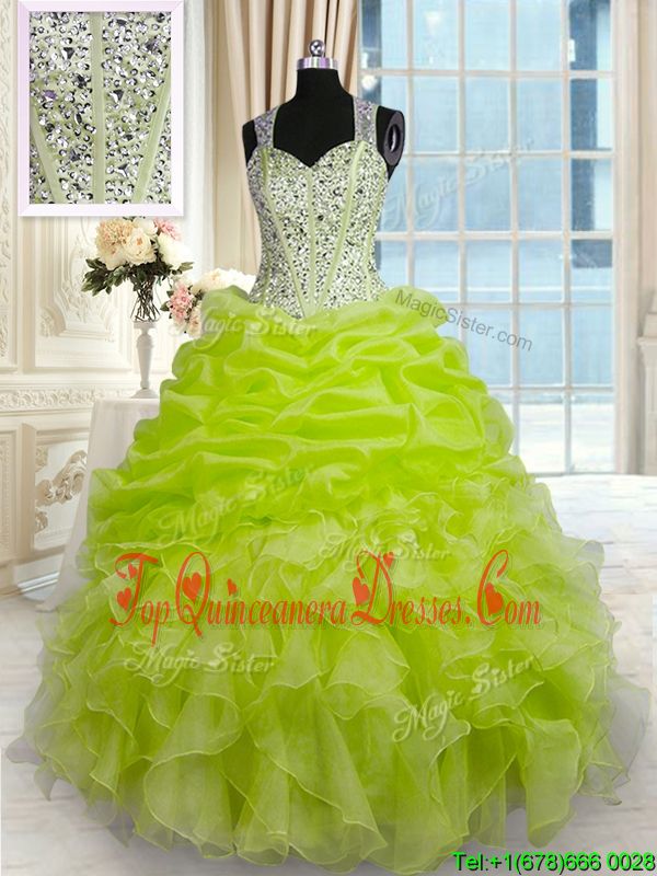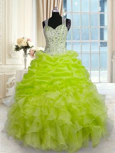 Organza and Taffeta Straps Sleeveless Zipper Beading and Ruffles and Pick Ups Quinceanera Dresses in Yellow Green