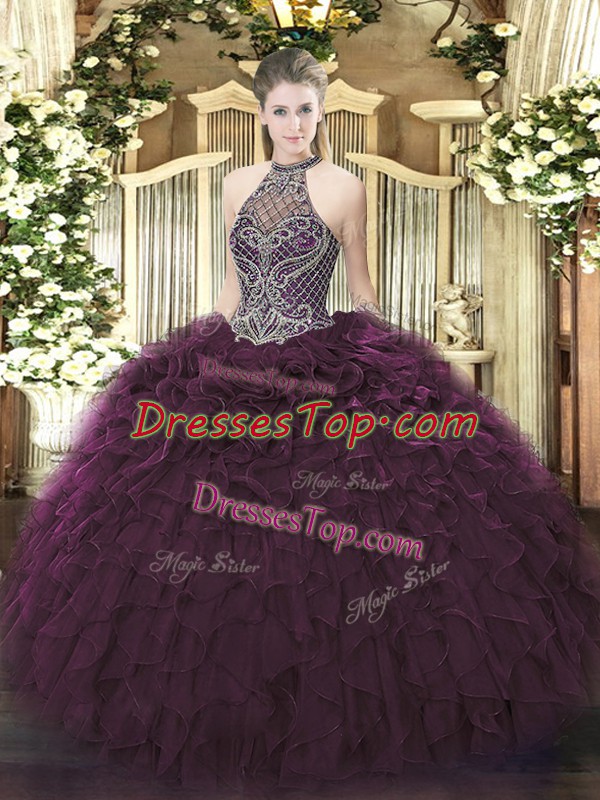 Organza Halter Top Sleeveless Lace Up Beading and Ruffles Quinceanera Dresses in Dark Purple