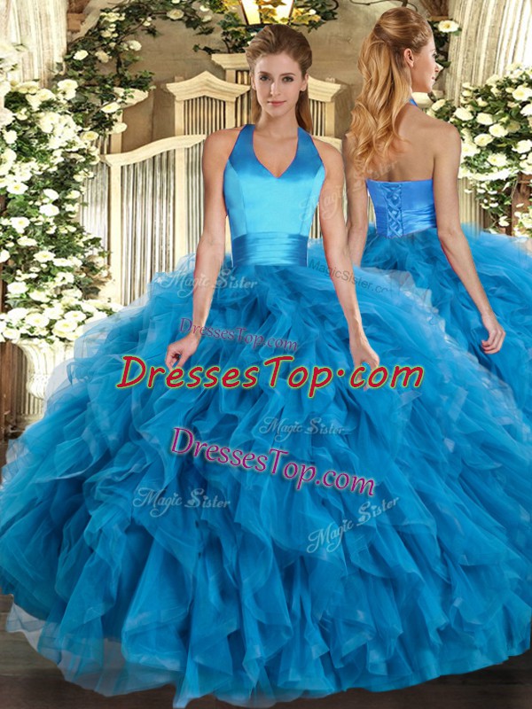 Organza Halter Top Sleeveless Lace Up Ruffles Quince Ball Gowns in Baby Blue