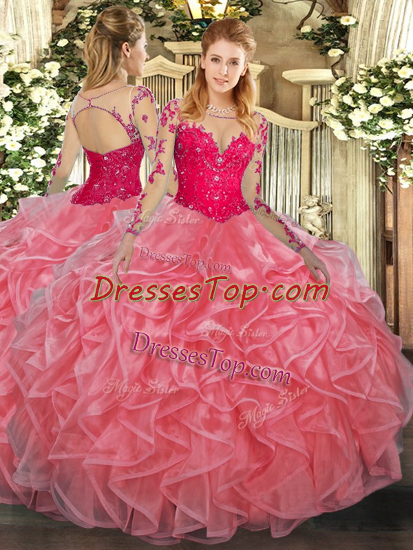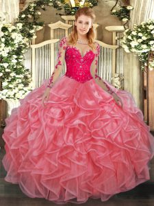 Organza Long Sleeves Floor Length 15 Quinceanera Dress and Lace and Ruffles