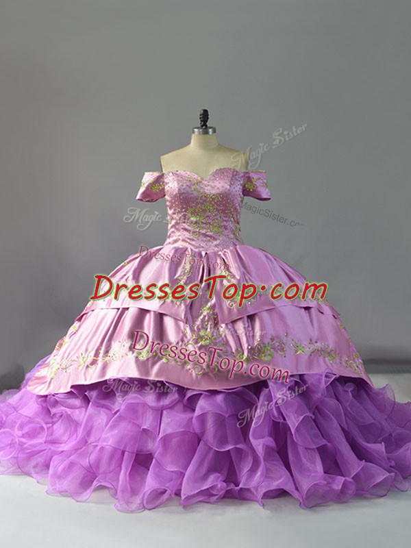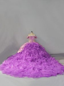 Organza Off The Shoulder Sleeveless Chapel Train Lace Up Beading and Embroidery and Ruffles Vestidos de Quinceanera in Lavender