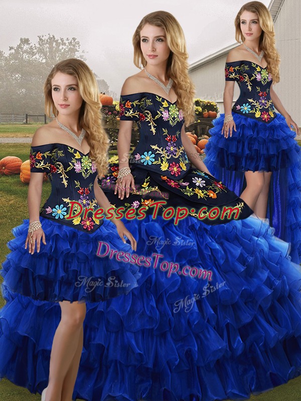 Organza Off The Shoulder Sleeveless Lace Up Embroidery and Ruffled Layers Quinceanera Dresses in Blue And Black