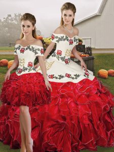 Organza Off The Shoulder Sleeveless Lace Up Embroidery and Ruffles 15th Birthday Dress in White And Red