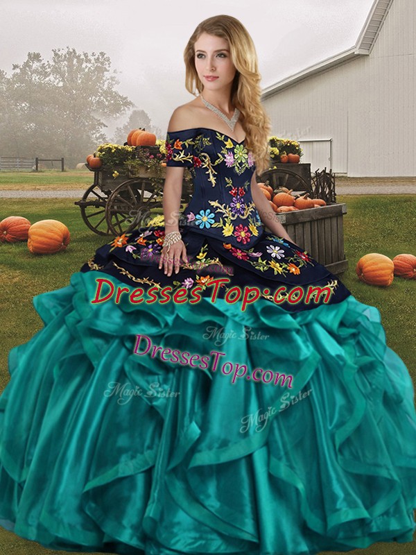 Organza Off The Shoulder Sleeveless Lace Up Embroidery and Ruffles Quinceanera Gowns in Teal