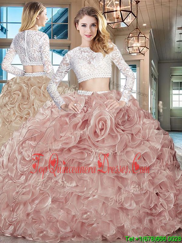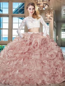 Organza Scoop Long Sleeves Brush Train Zipper Beading and Lace and Ruffles Quinceanera Dress in Pink