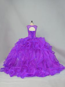 Organza Scoop Sleeveless Brush Train Lace Up Beading and Ruffles Sweet 16 Dresses in Purple