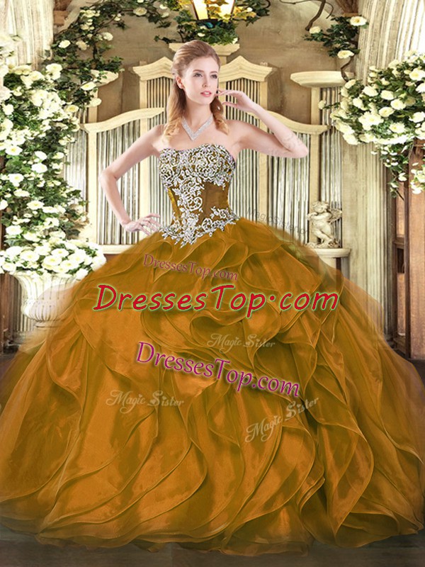 Organza Strapless Sleeveless Lace Up Beading and Ruffles Vestidos de Quinceanera in Brown