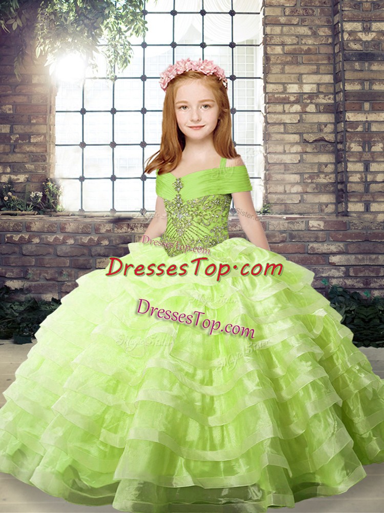 Organza Straps Sleeveless Brush Train Lace Up Beading and Ruffled Layers Little Girl Pageant Gowns in Yellow Green