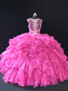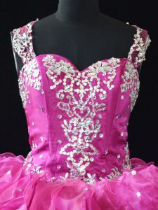 Organza Straps Sleeveless Lace Up Beading and Ruffles Sweet 16 Dresses in Fuchsia