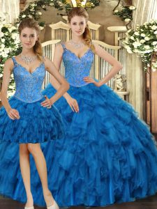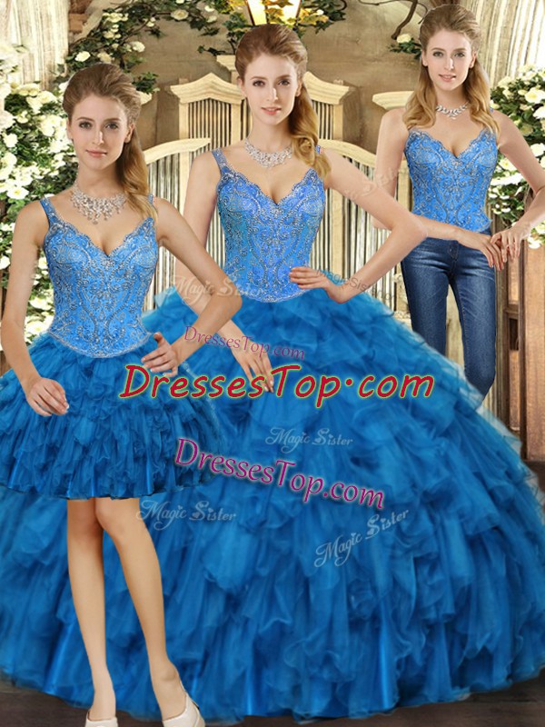 Organza Straps Sleeveless Lace Up Beading and Ruffles Vestidos de Quinceanera in Teal