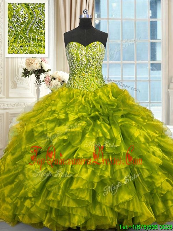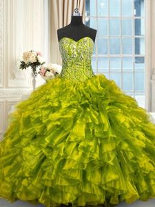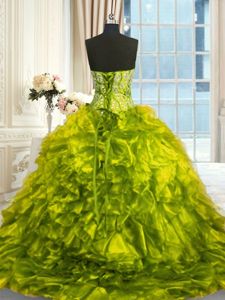 Organza Sweetheart Sleeveless Brush Train Lace Up Beading and Ruffles Sweet 16 Dress in Olive Green
