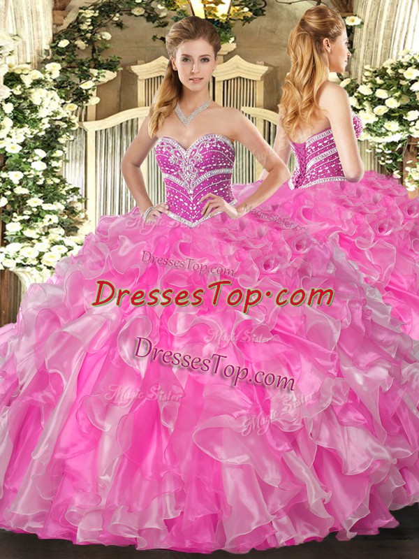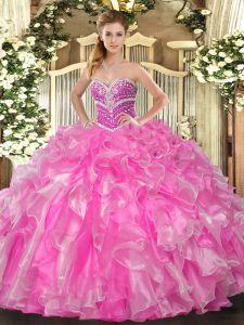 Organza Sweetheart Sleeveless Lace Up Beading and Ruffles Quinceanera Dresses in Rose Pink