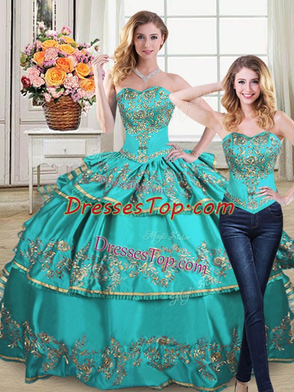 Organza Sweetheart Sleeveless Lace Up Embroidery and Ruffled Layers Ball Gown Prom Dress in Aqua Blue