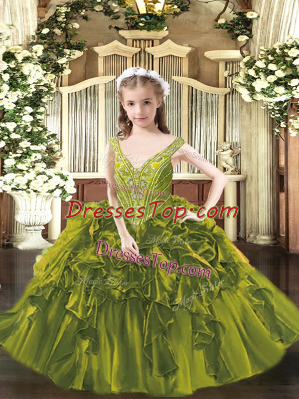 Organza V-neck Sleeveless Lace Up Beading and Ruffles Little Girls Pageant Gowns in Olive Green