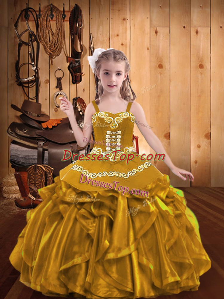 Organza V-neck Sleeveless Lace Up Embroidery and Ruffles Little Girls Pageant Gowns in Gold