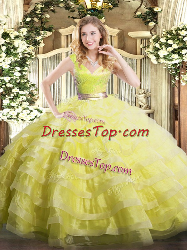 Organza V-neck Sleeveless Zipper Ruffled Layers Sweet 16 Dresses in Yellow Green