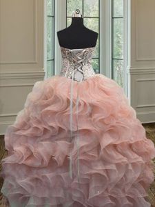 Peach Ball Gowns Beading and Ruffles Sweet 16 Quinceanera Dress Lace Up Organza Sleeveless Floor Length