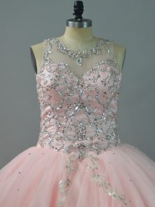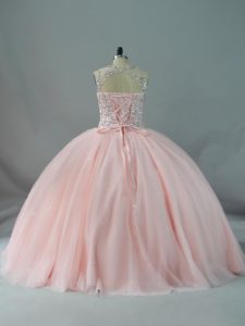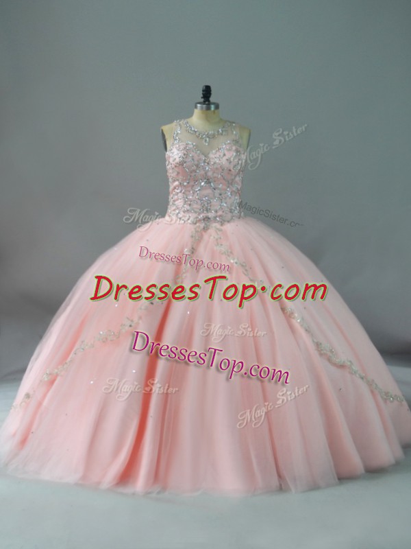 Peach Ball Gowns Beading Quince Ball Gowns Lace Up Tulle Sleeveless