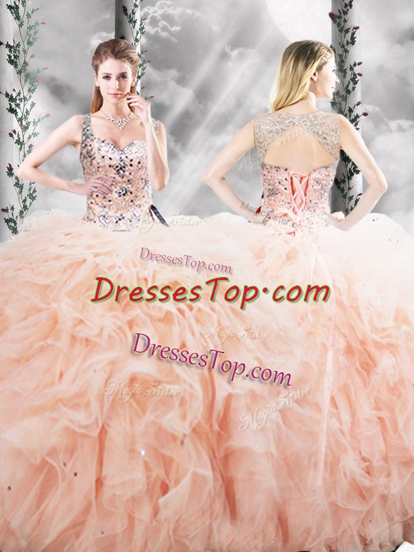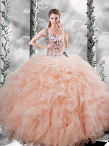 Peach Ball Gowns Straps Sleeveless Tulle Floor Length Lace Up Beading and Ruffles Sweet 16 Quinceanera Dress