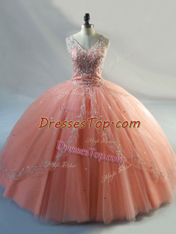 Peach Ball Gowns Tulle V-neck Sleeveless Beading Floor Length Lace Up Ball Gown Prom Dress