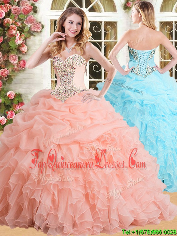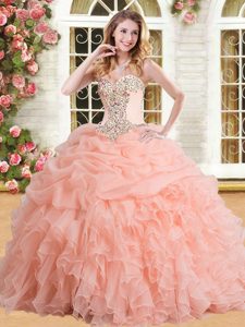 Peach Lace Up Quinceanera Dress Appliques and Ruffles and Pick Ups Sleeveless Floor Length