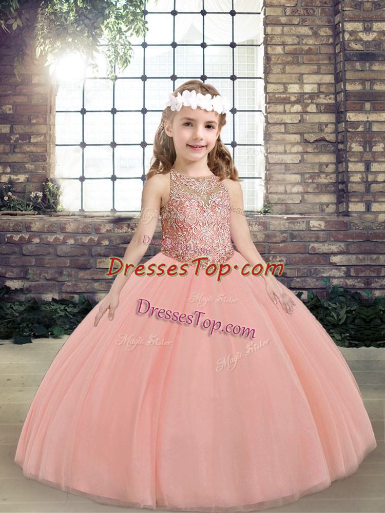 Peach Lace Up Scoop Beading Kids Formal Wear Tulle Sleeveless