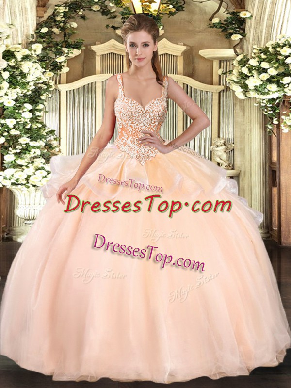 Peach Lace Up Sweet 16 Dresses Beading Sleeveless Floor Length