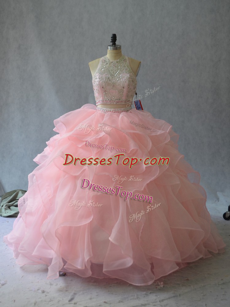 Peach Organza Backless Vestidos de Quinceanera Sleeveless Beading and Ruffles