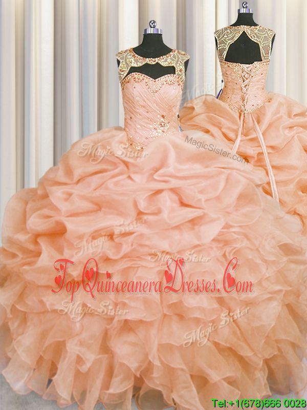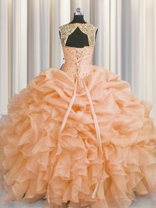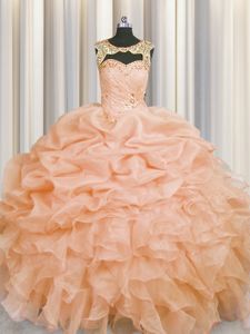 Peach Scoop Lace Up Beading and Pick Ups Sweet 16 Quinceanera Dress Sleeveless