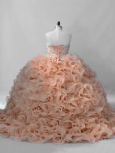 Peach Sleeveless Fabric With Rolling Flowers Brush Train Lace Up Ball Gown Prom Dress for Sweet 16 and Quinceanera
