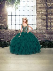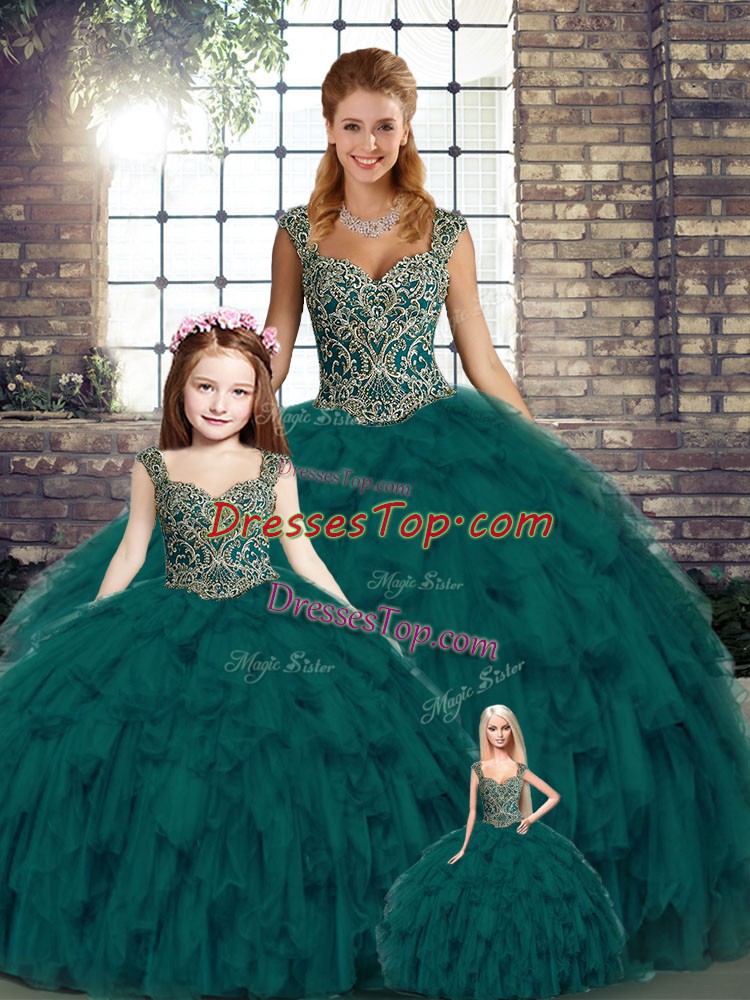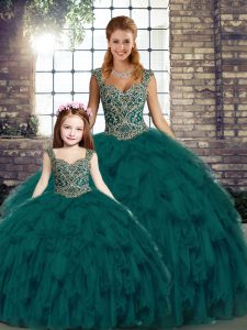 Peacock Green Ball Gowns Organza Straps Sleeveless Beading and Ruffles Floor Length Lace Up Quinceanera Dress