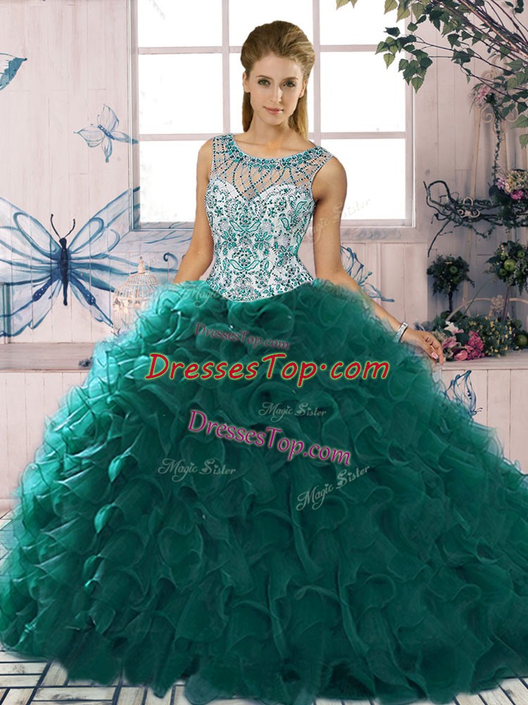 Peacock Green Sleeveless Floor Length Beading and Ruffles Lace Up Sweet 16 Dresses
