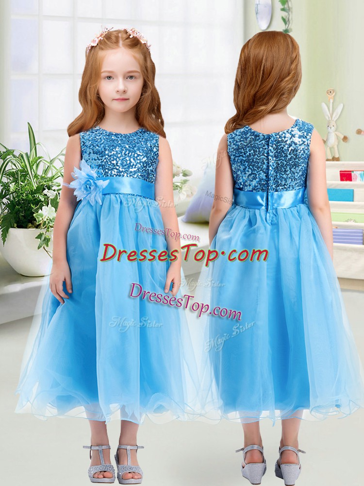 Perfect Baby Blue Empire Sequins and Hand Made Flower Pageant Gowns For Girls Zipper Organza Sleeveless Tea Length