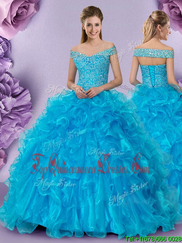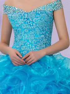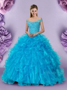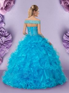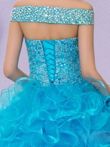 Perfect Baby Blue Off The Shoulder Lace Up Beading and Lace and Ruffles Vestidos de Quinceanera Sleeveless