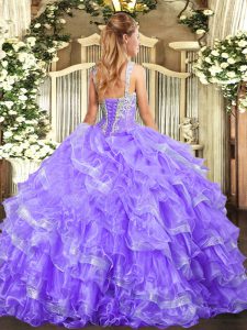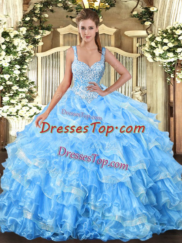 Perfect Baby Blue Organza Lace Up 15th Birthday Dress Sleeveless Floor Length Beading and Ruffled Layers