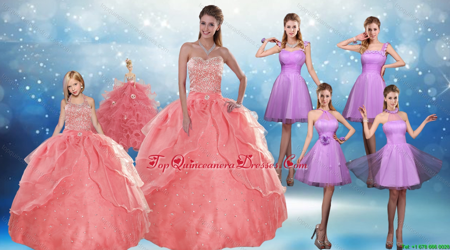 Perfect Beading Floor Length Quinceanera Dress and Short Ruching Prom Dresses and Watermelon Halter Top Little Girl Dress