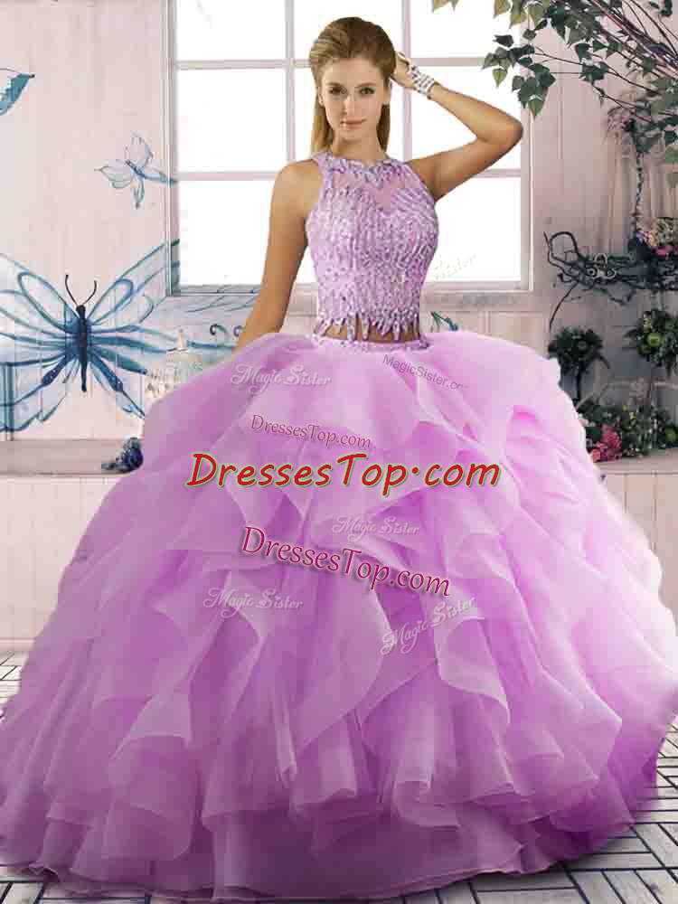 Perfect Floor Length Lilac 15 Quinceanera Dress Tulle Sleeveless Beading and Ruffles
