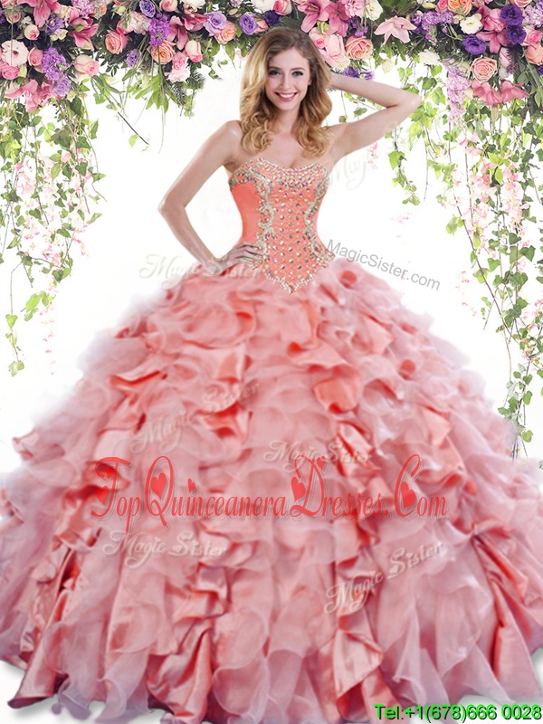 Perfect Floor Length Watermelon Red 15 Quinceanera Dress Organza and Taffeta Sleeveless Beading and Ruffles