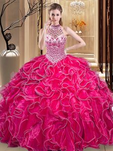 Perfect Hot Pink Halter Top Lace Up Beading and Ruffles Quinceanera Dresses Sleeveless