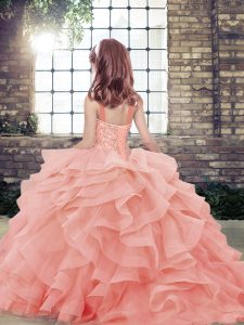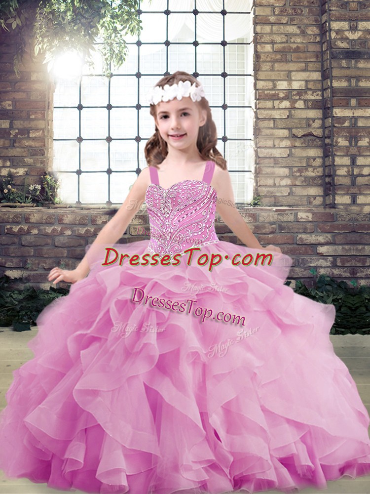 Perfect Lilac Ball Gowns Straps Sleeveless Tulle Floor Length Lace Up Beading and Ruffles Little Girls Pageant Dress Wholesale