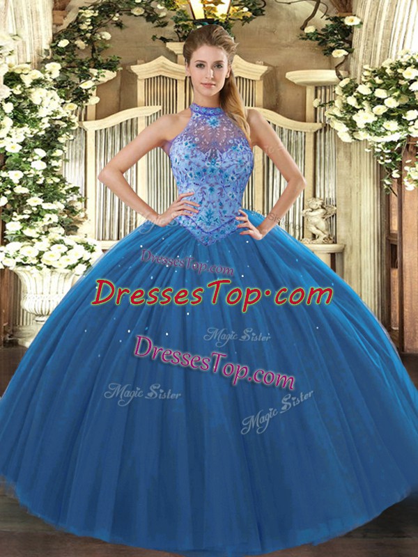 Perfect Navy Blue Lace Up Halter Top Beading and Embroidery Ball Gown Prom Dress Tulle Sleeveless