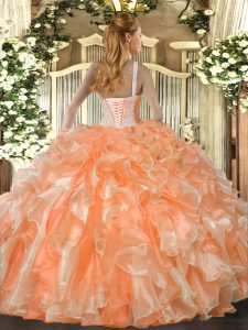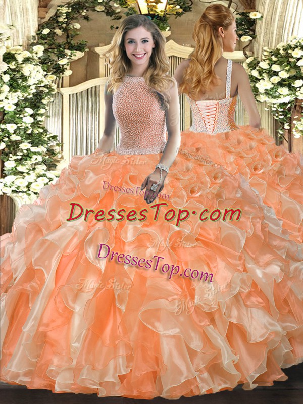Perfect Orange Red Sleeveless Floor Length Beading and Ruffles Lace Up 15 Quinceanera Dress